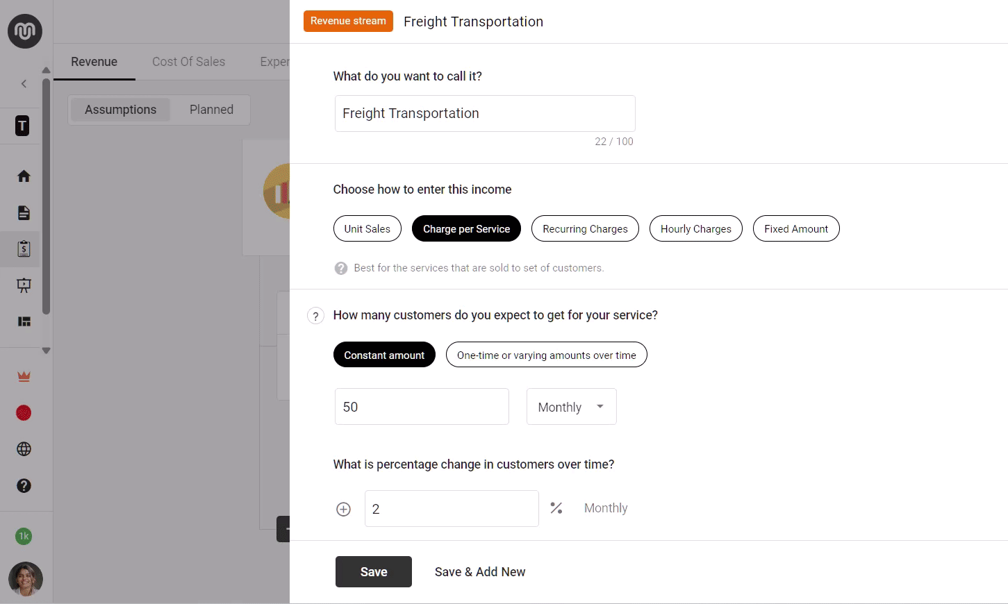 Let’s say you’re forecasting revenue for a logistics business. When setting up the entry, choose the option " One time or Varying Amounts Over Time" instead of a constant value. This option lets you fine-tune the forecast by entering specific values that may fluctuate month to month or based on the frequency.