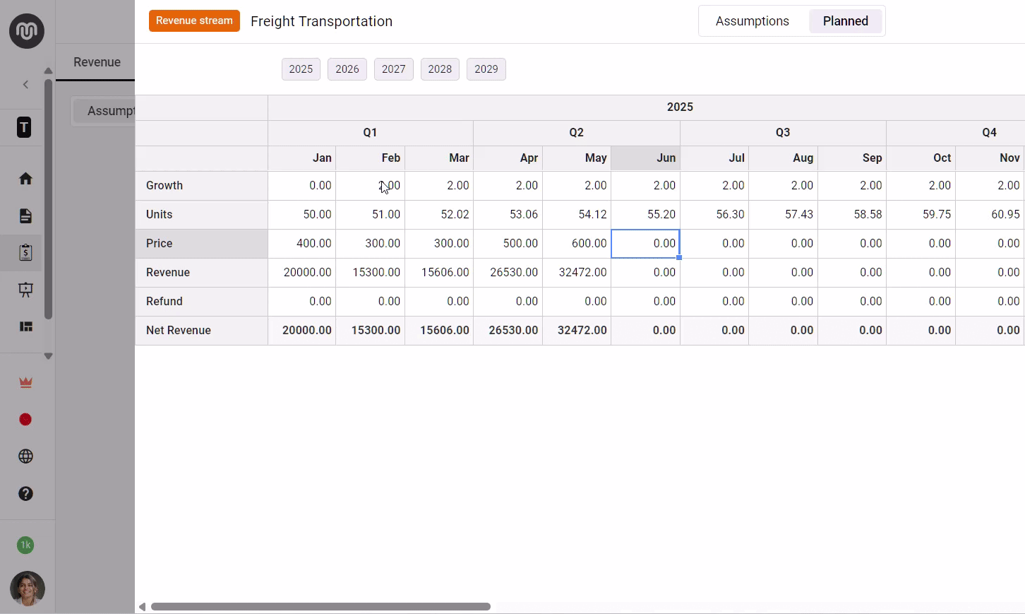 Once the entry is created or once you edit the finance item, you'll be taken to the Finance Forecast sheet, where you can edit the Units, Price, and Growth rate directly on the forecast sheet.