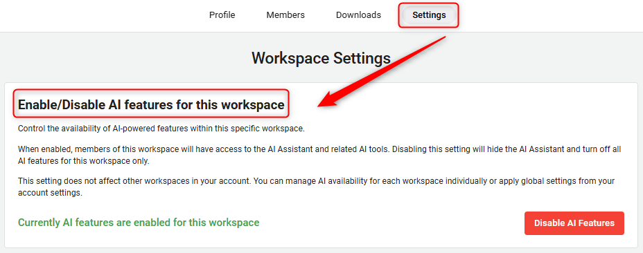 Now, in the Settings tab, locate the Enable/Disable AI features for this workspace section.
