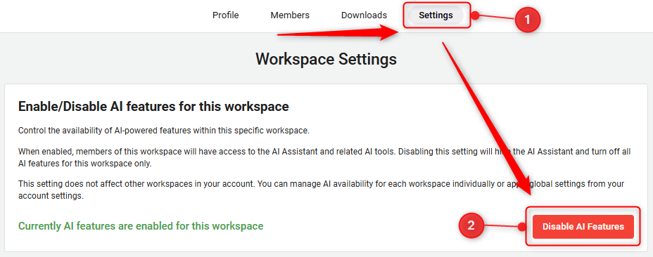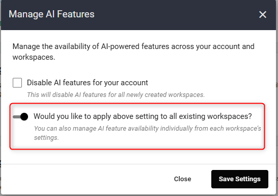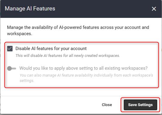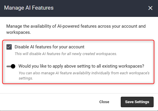 - Disabling AI for All Workspaces (Current and New): Enabling both options and saving the settings will disable the AI feature for all your existing workspaces and automatically turn it off for any newly created workspaces as well. This ensures AI remains disabled across your entire account.