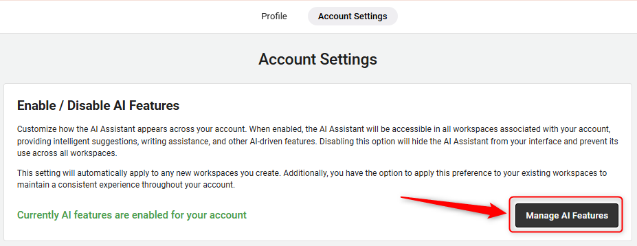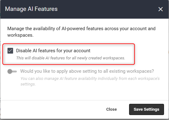 - Disabling AI for All Newly Created Workspaces: If you select the Disable AI features for your account option and save the settings, the AI feature will be turned off by default in all newly created workspaces. Existing workspaces will remain unaffected unless you choose to apply the setting to them separately.