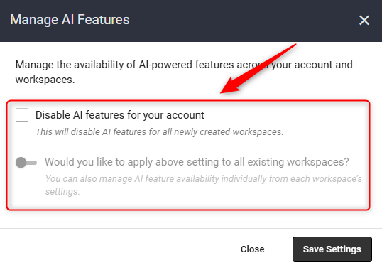 - Disable AI features for your account: This setting will disable AI features in all newly created workspaces moving forward.