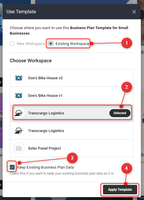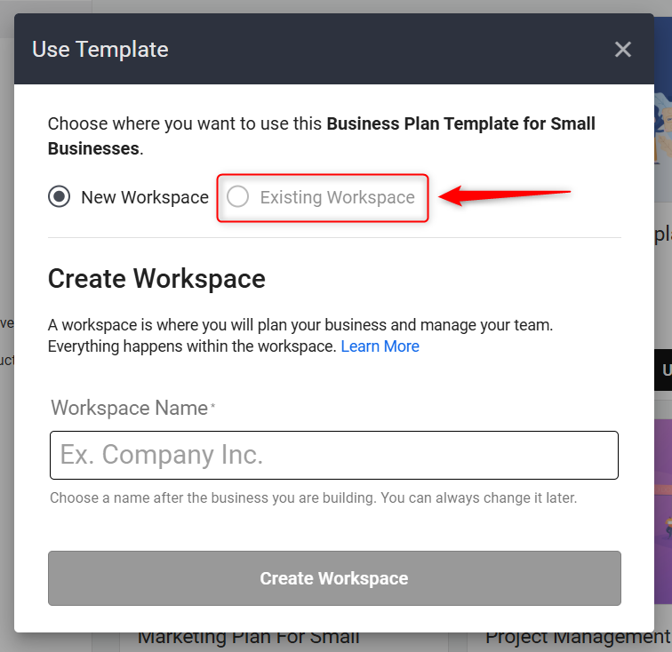A pop-up will appear. Choose the Existing Workspace option to apply the template to a business plan you’ve already started.