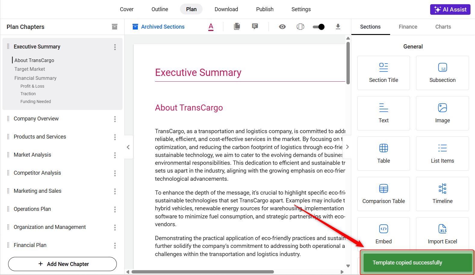 i.e., Let’s use the Logistics Business Plan template and apply it to the existing business plan for TransCargo Logistics.