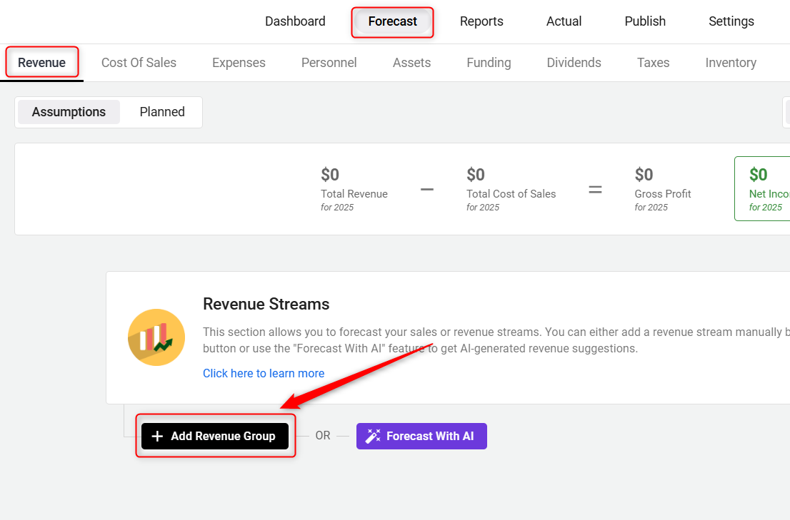 In your Finance Forecasting module, navigate to the Revenue tab under the Forecast tab and click on the Add Revenue Group option: