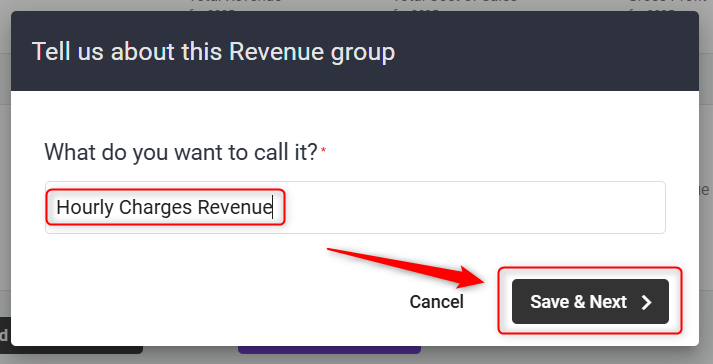 A pop-up will appear. Enter the Revenue Stream group title, then click on Save & Next.