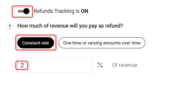 Refund: Unexpected refund risks are involved with your service business if you are going to provide a refund to your customers. Let's enter how much refund rate you estimate over the revenue generated by Revenue Stream:
