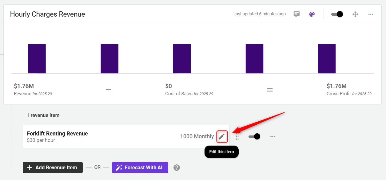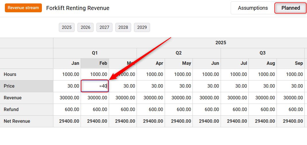 A forecast sheet will appear. To start editing the revenue stream item, double-click any cell to input a new value.