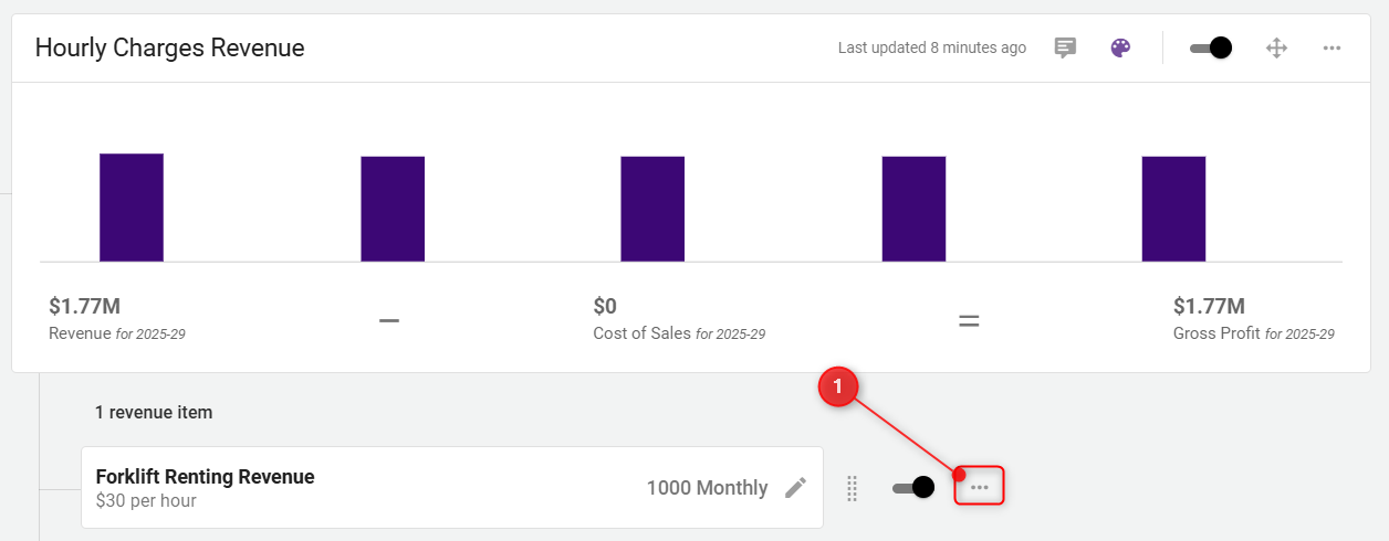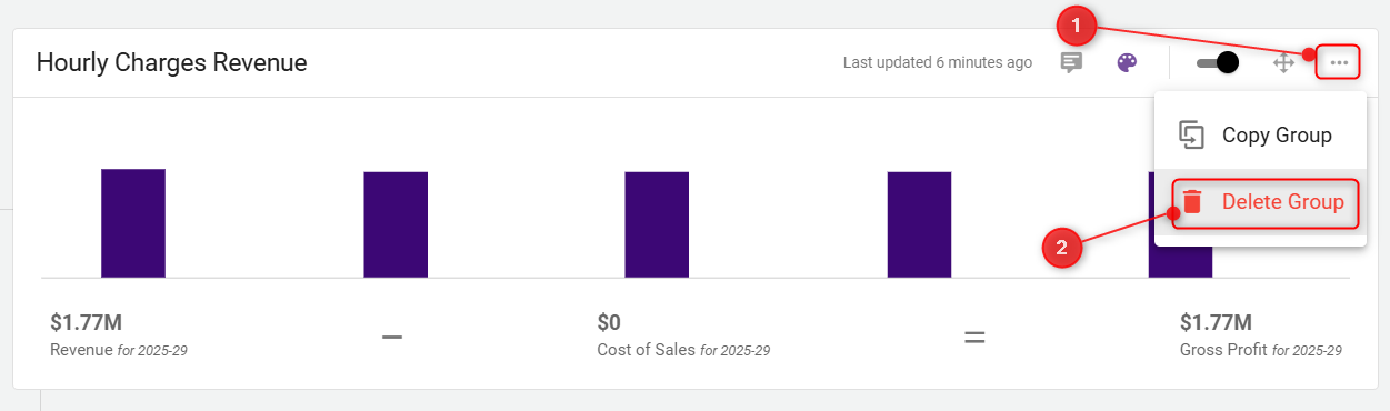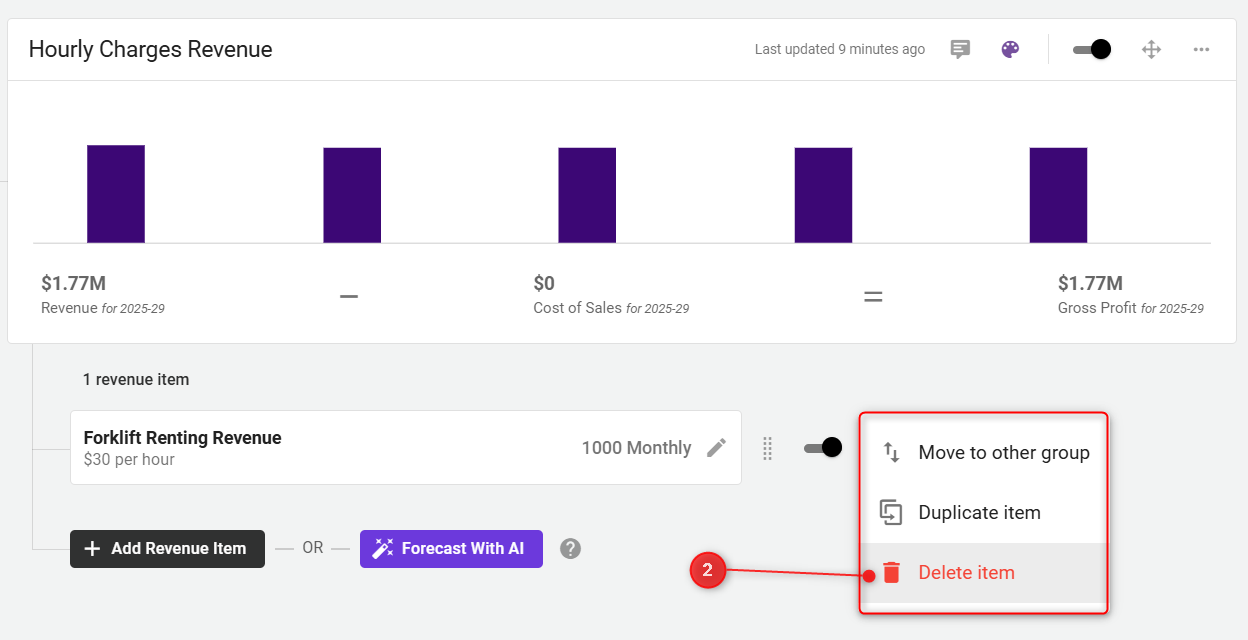 To delete an individual revenue item within a group, go to the respective revenue group, click the three-dot menu next to the item, and choose Delete Item.