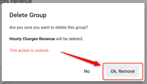 A confirmation pop-up will appear. Click Ok, Remove to permanently delete the revenue group.