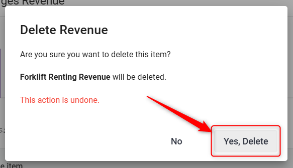 A confirmation pop-up will appear. Click Yes, Delete to remove the revenue item.