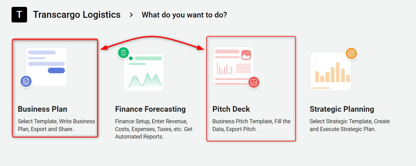 In Upmetrics, the Business Plan Builder and Pitch Deck Builder are two separate tools, each tailored for a specific purpose. Currently, it’s not possible to directly convert or upload your business plan to generate a pitch deck.
