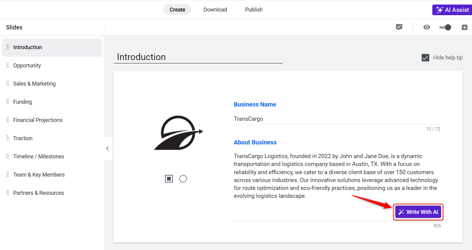 However, you can make use of the AI Assistant in the Pitch Deck Builder to help generate pitch content for your slides. This allows you to repurpose your ideas and content from the business plan manually or with AI help to build a compelling pitch deck.
