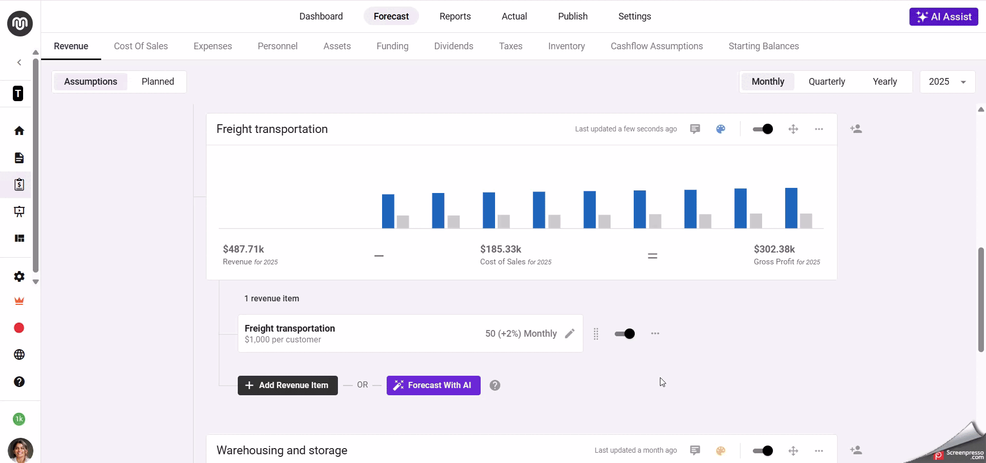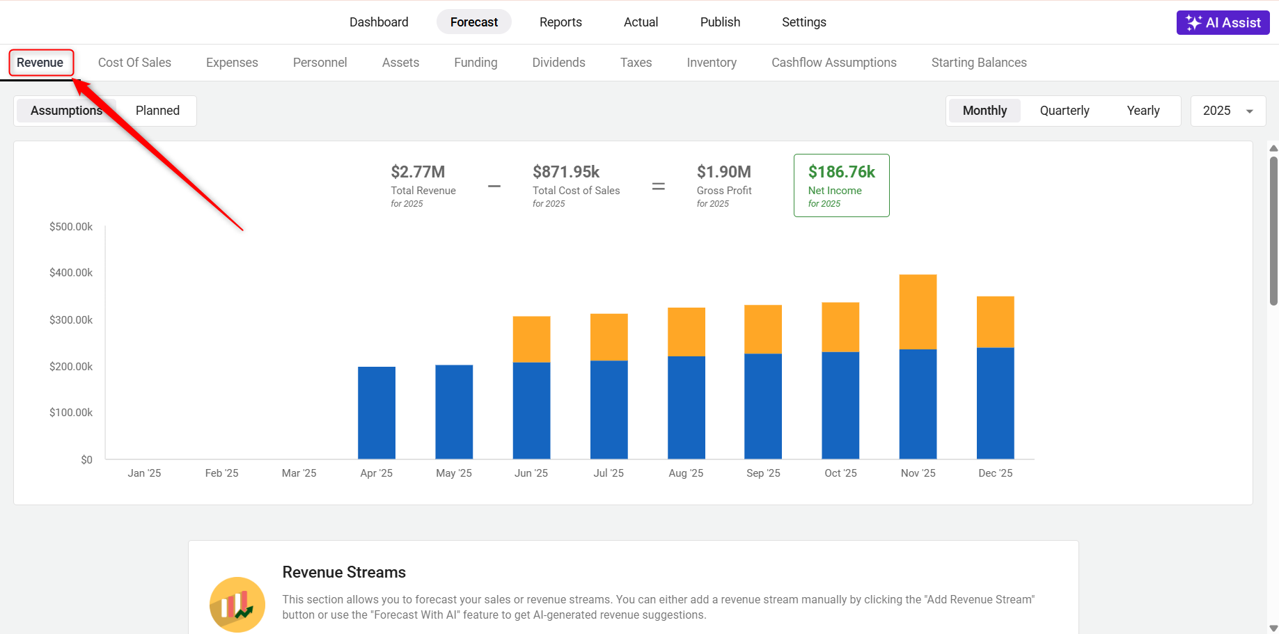 Just like revenue, you can update or enter figures for other financial streams, such as Cost of Sales, Expenses, Personnel, Assets, Funding, and other financial streams.