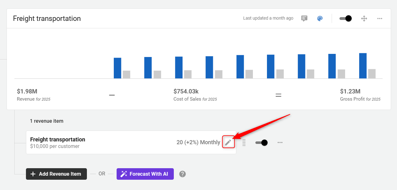 Find the specific revenue item you want to update, and click on the Edit icon next to it.