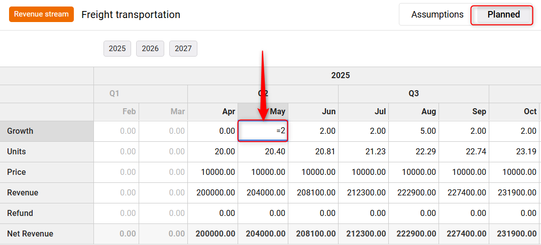 Here, you can double-click on any editable cell, such as Growth Rate, Units, Price, or Revenue, to enter or update your own figures.