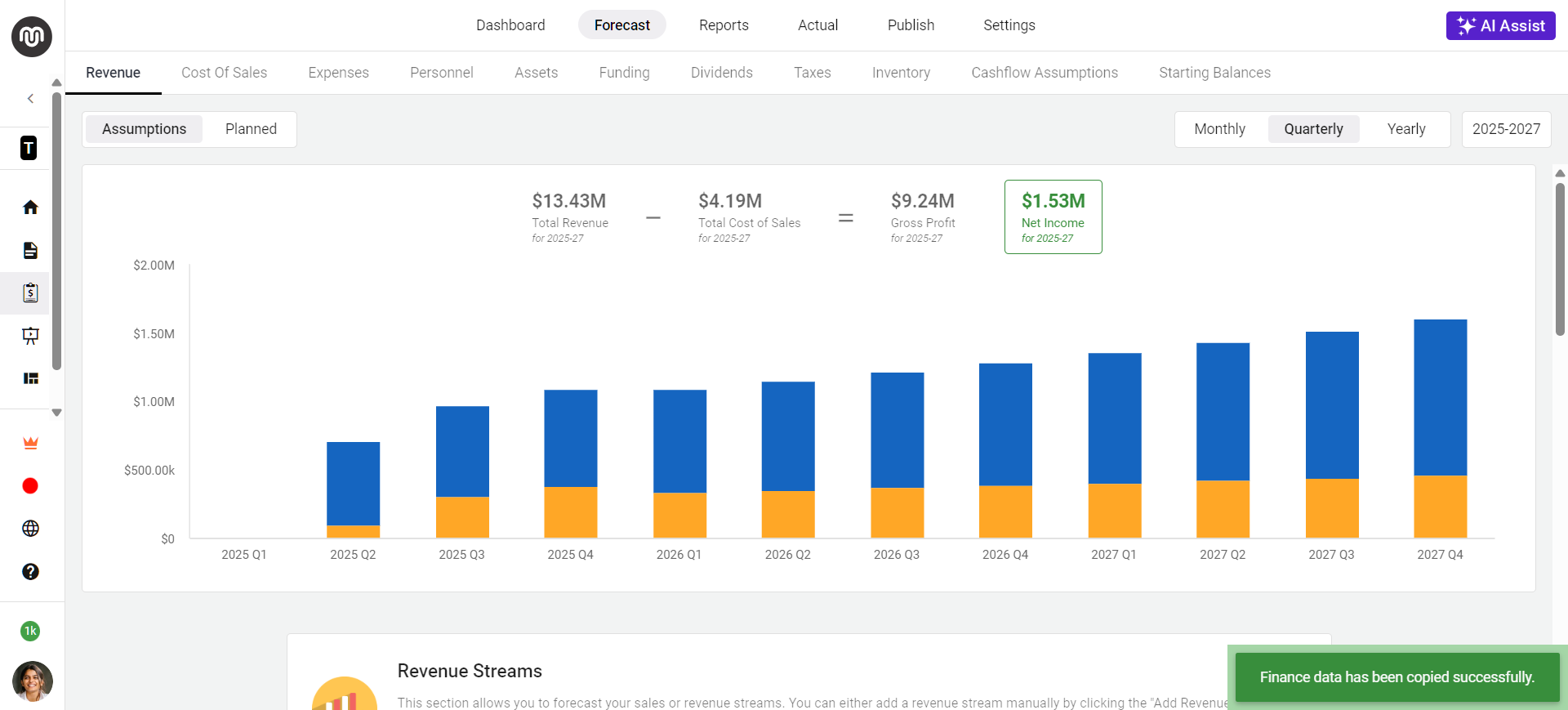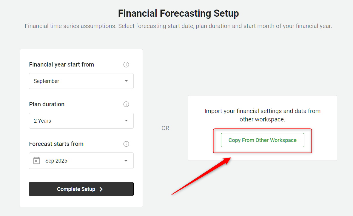 When working across multiple workspaces, it’s not always practical or efficient to recreate your entire financial forecast from the ground up every time. Whether you’re managing different business plans, creating versions for separate clients, or testing out new scenarios, having a way to quickly duplicate your financial data can be a real time-saver.