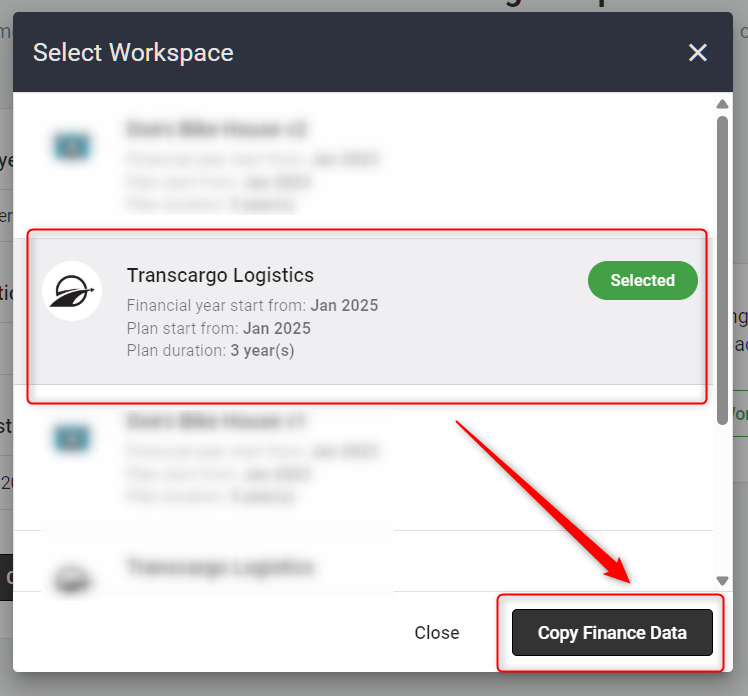 From this list, select the workspace that contains the financial data you wish to duplicate. Then, click on Copy Finance Data.