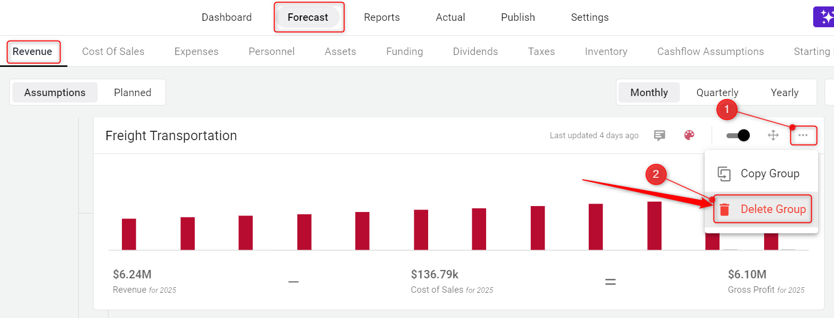 Open the Forecast tab, then select Revenue. Locate the revenue group you want to remove and click the three dots menu beside it.