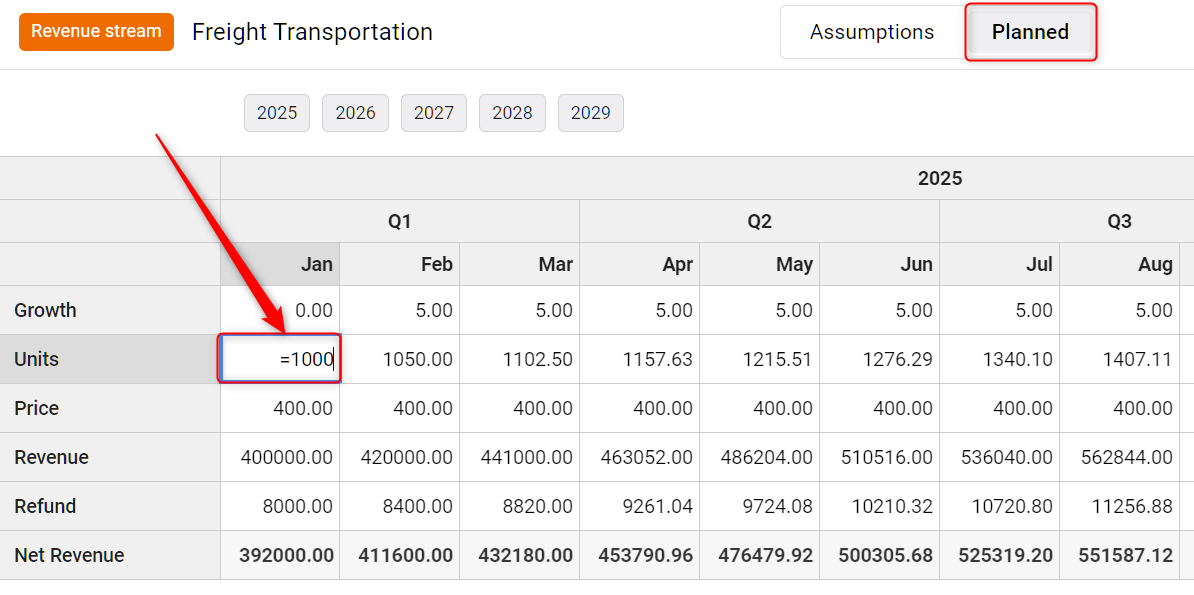 TIP: Use the Planned tab in the Forecasting Sheet when you need to override month-by-month figures while keeping your base assumptions intact.