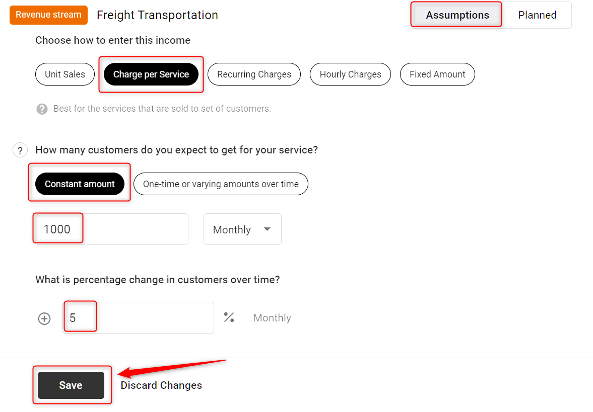 To adjust the item’s base inputs, click the Assumptions tab at the top to open the Forecasting Form. Update the inputs (e.g., entry method, quantities, frequency, or growth), then click Save.
