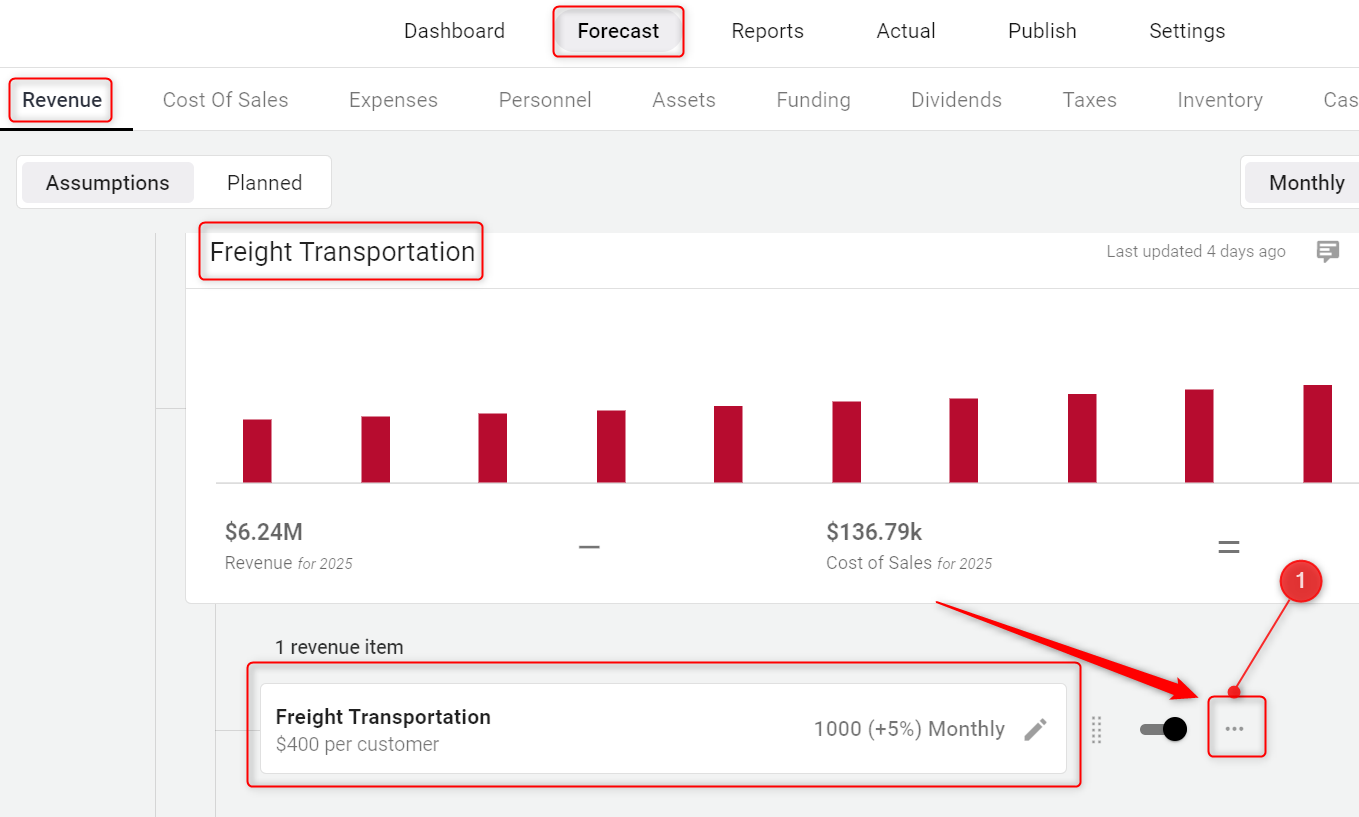 In Forecast > Revenue, find the specific revenue item. Click the three dots menu to the right of the item.