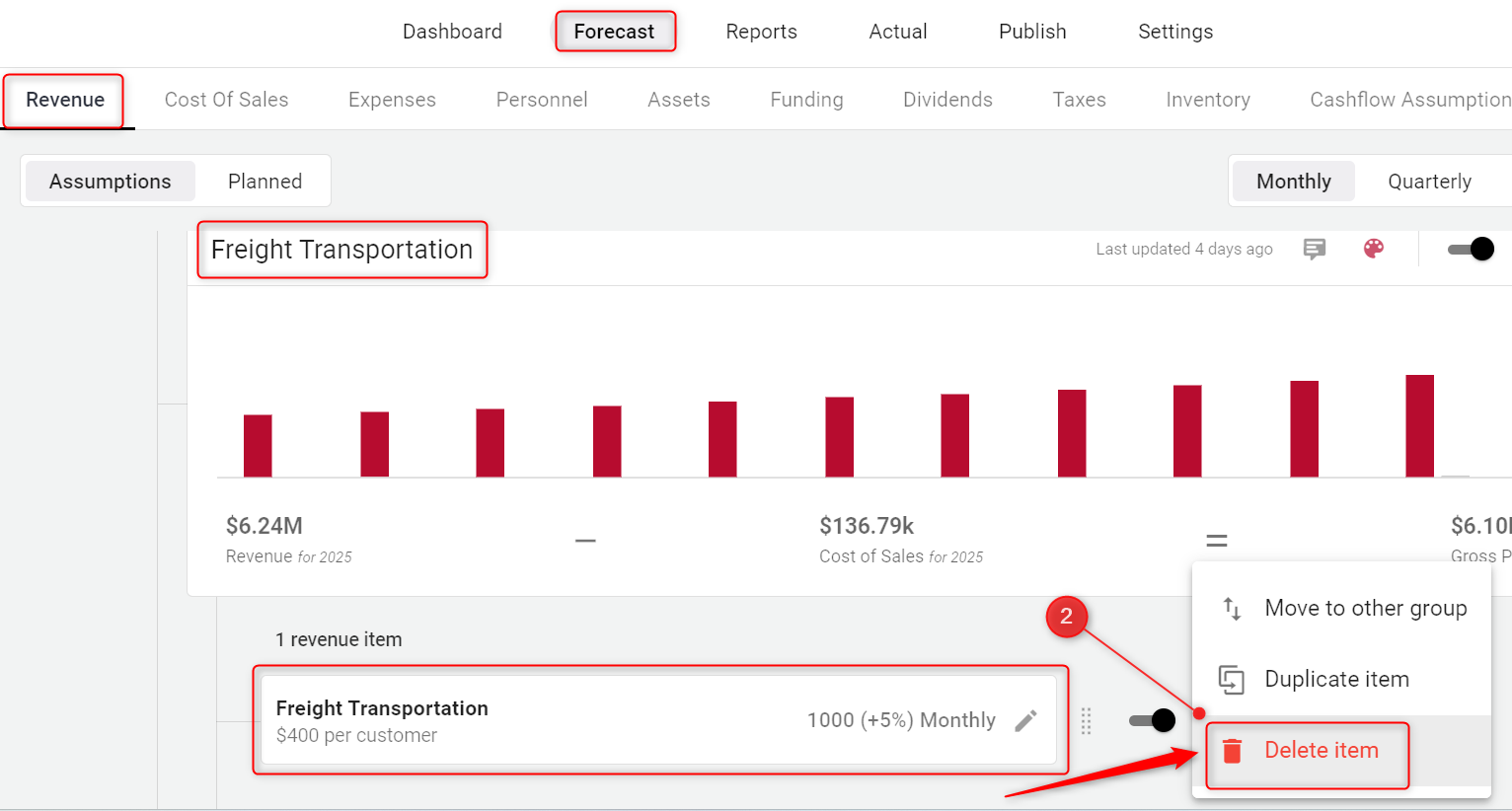 That’s it! You can now edit individual revenue items, delete items you no longer need, or remove entire revenue groups to keep your forecasts clean and organized.