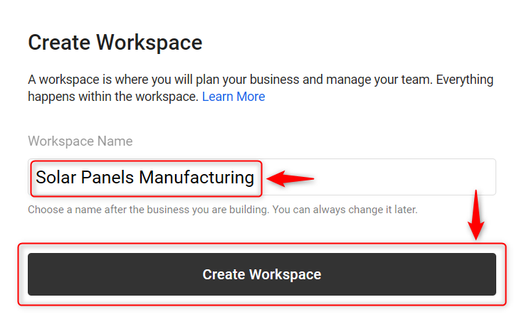 Enter a name for your workspace (e.g., Solar Panels Manufacturing) and click Create Workspace.