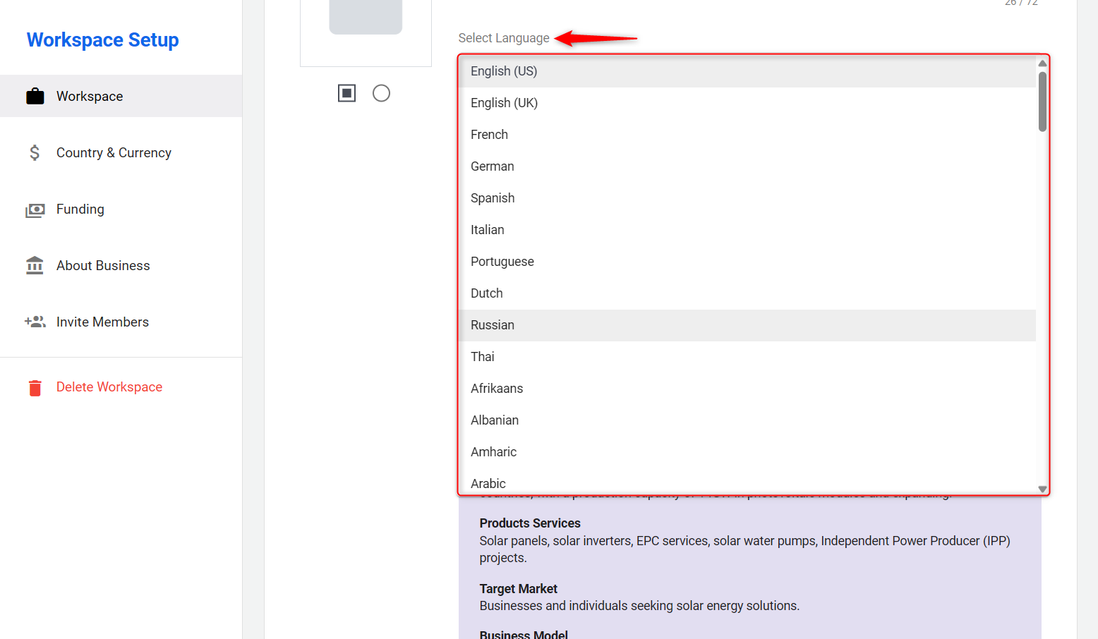 Under Workspace Setup > Workspace, open the Select Language dropdown to choose your preferred or native language.