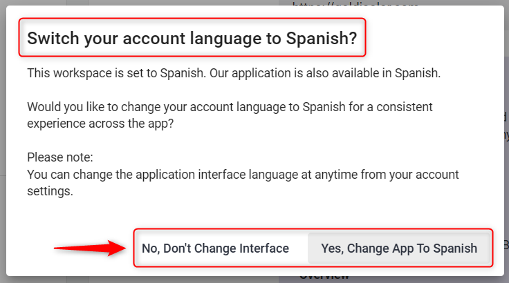If your selected workspace language is one of the supported interface languages (English, Français, Deutsch, Español, Italiano, Português), Upmetrics will ask if you want to change your app interface as well. Choose Yes or No as preferred.