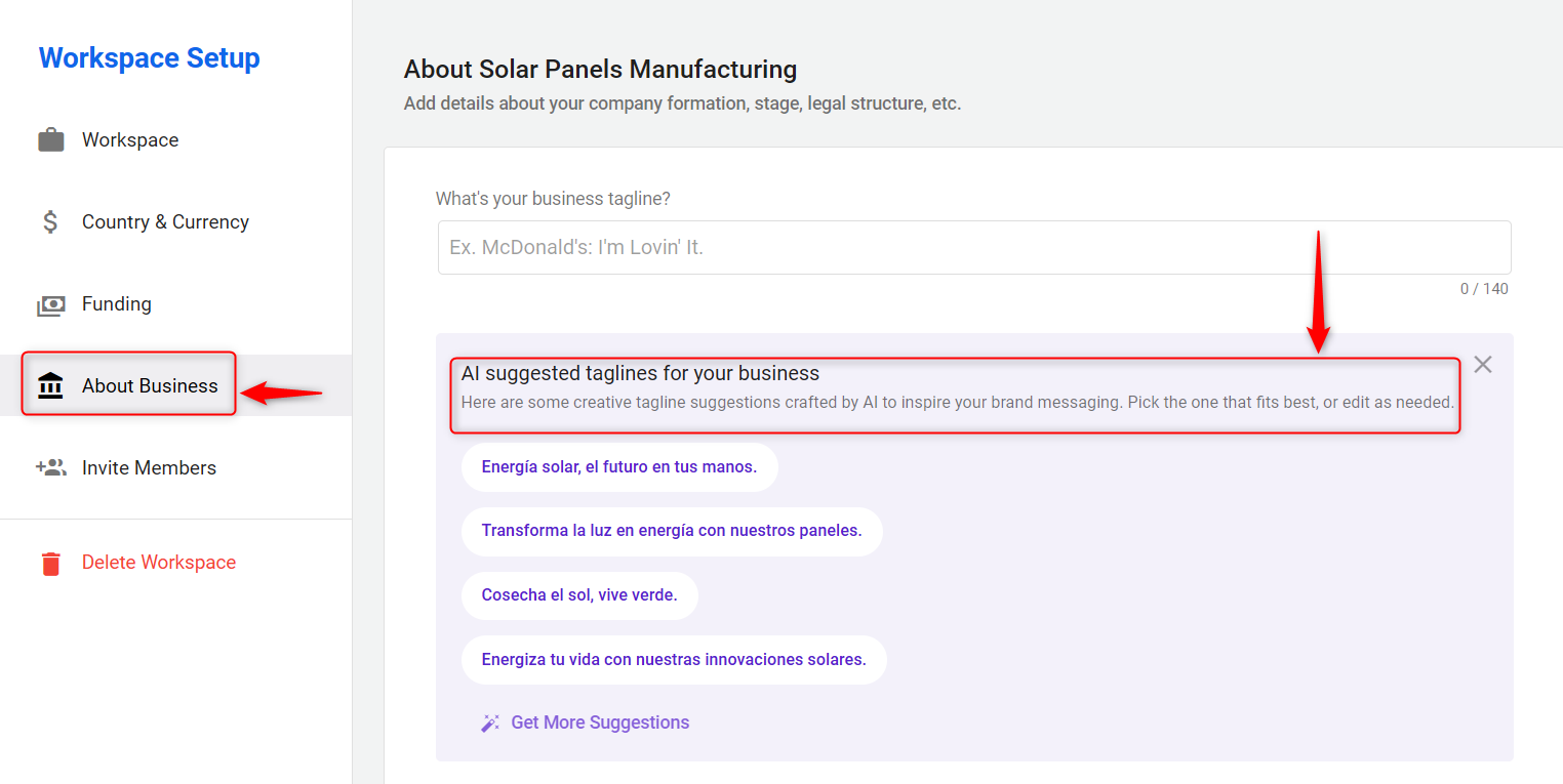 In the About Business section, you’ll notice AI-generated tagline suggestions appear in your selected language.