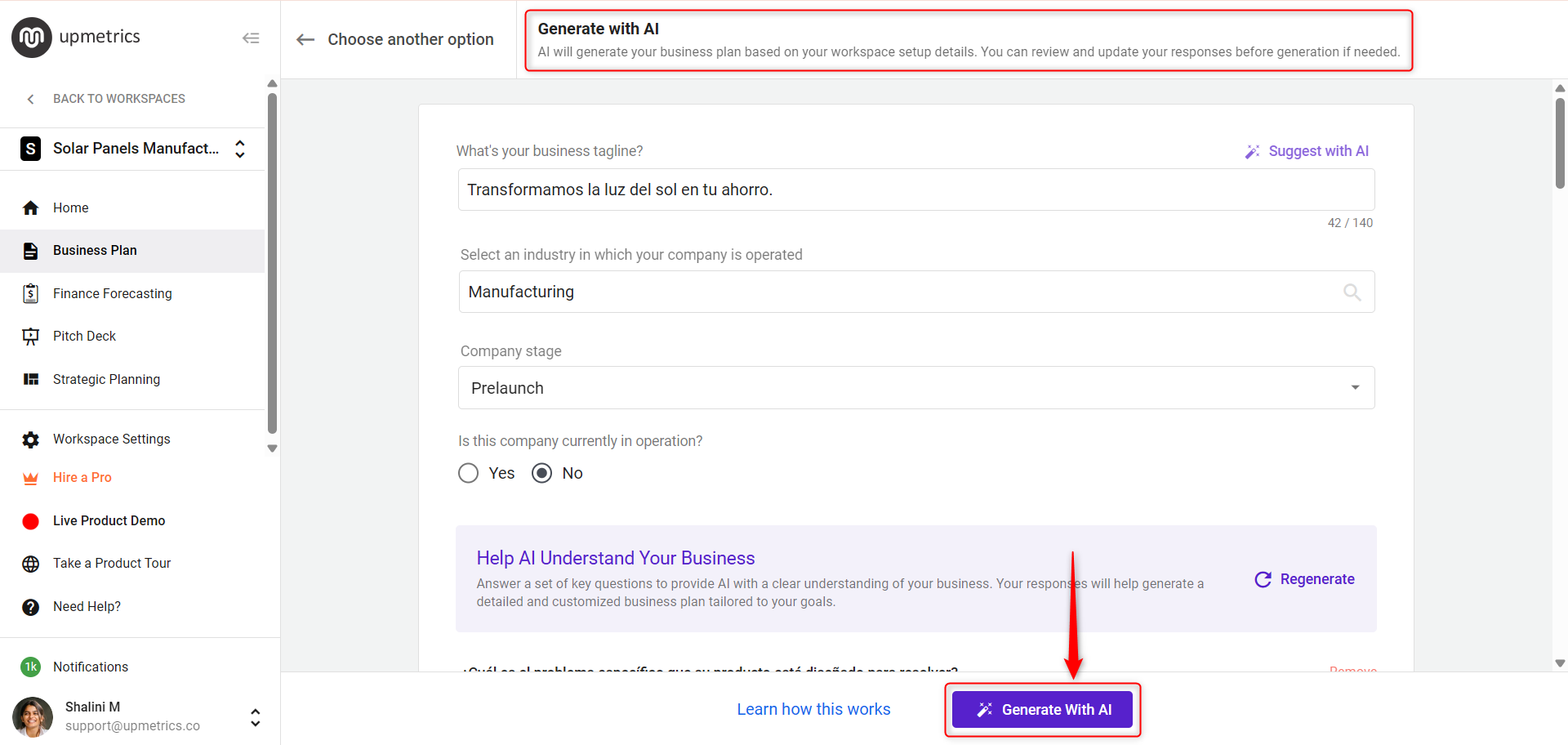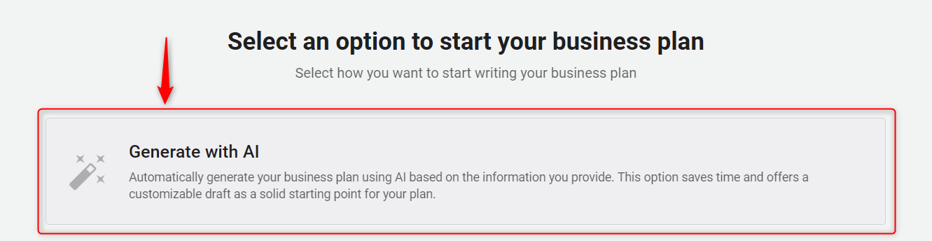 You’ll see multiple options to generate your business plan. Select the Generate with AI option.
