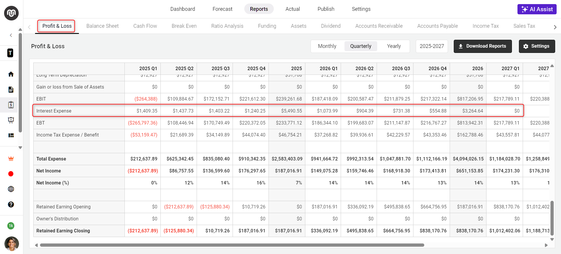 When you enter a Loan or another entry, only the interest portion will appear in your Profit and Loss statement. This is because the interest is the only true cost your business incurs in the loan: