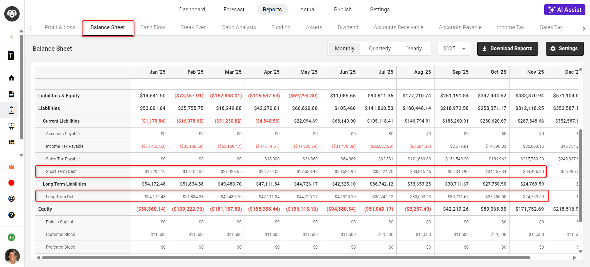 Loans will appear on one or two lines of the Balance Sheet, depending on their length. A loan that will be paid back within 12 months appears as Short-Term Debt. A loan of longer than 12 months will be divided into Long-Term Debt.