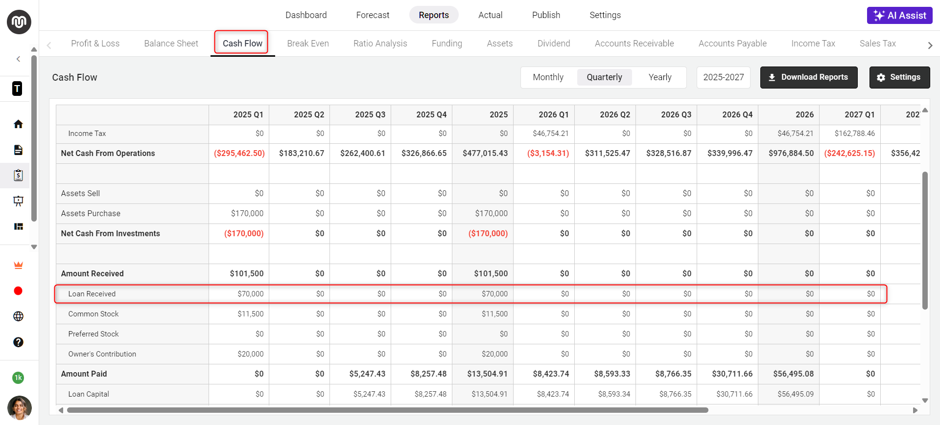 In the Cash Flow, similarly, loans will be considered under the Loan Received section: