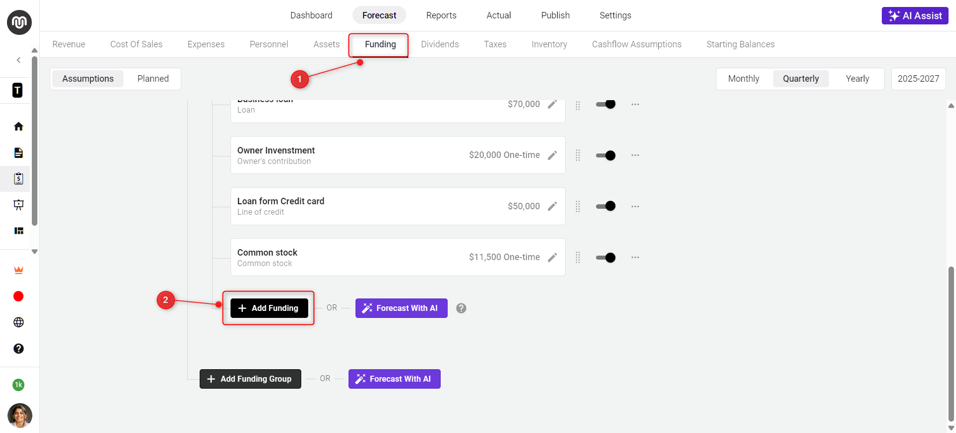 Under the financial forecasting module, click on the Funding tab, and then click the Add Funding option: