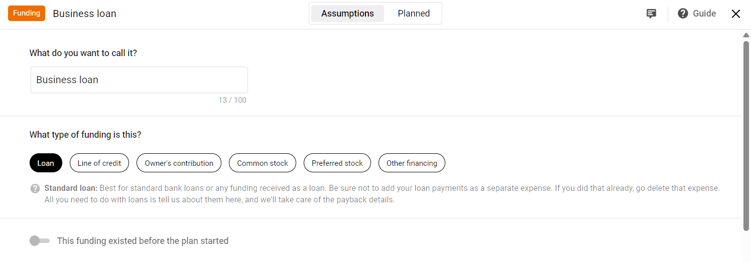 Enter a name for the loan, and select the funding type as Loan. Turn on the toggle if the loan existed before the plan started.