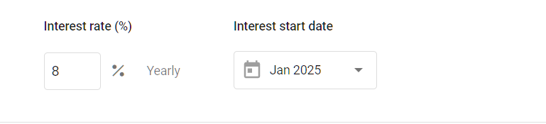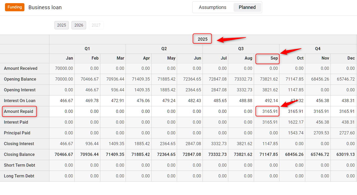 Example: If you receive a loan in January 2025 but the conditions allow you not to start repayments until Sep 2025, you would set the 'Repayment Start Date' to Sep 2025. This setting helps synchronize your financial projections with actual cash flow requirements.