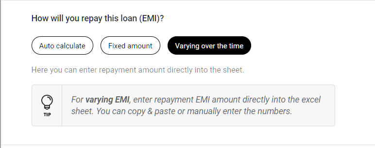 Select how you intend to repay the loan: through calculated estimations, fixed payments, or adjustments over time.