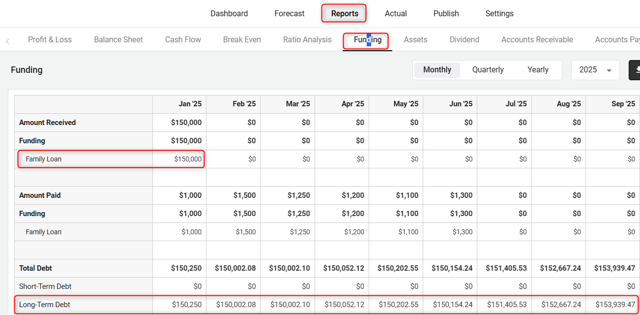 Access the Funding report to review your configured debts, including both long-term and short-term liabilities listed in the finance section.