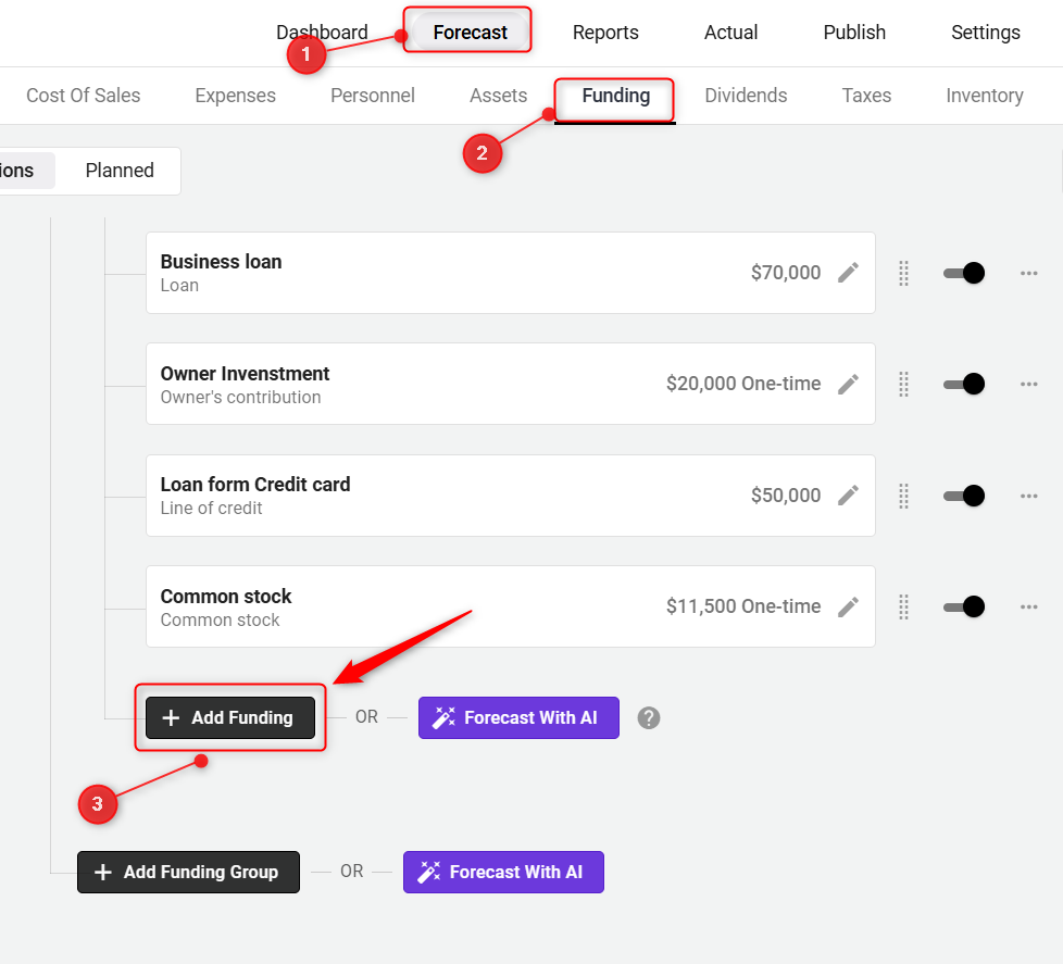 Under the Forecast tab of the Finance Forecasting module, click on the Funding tab, and then click on the Add Funding option: