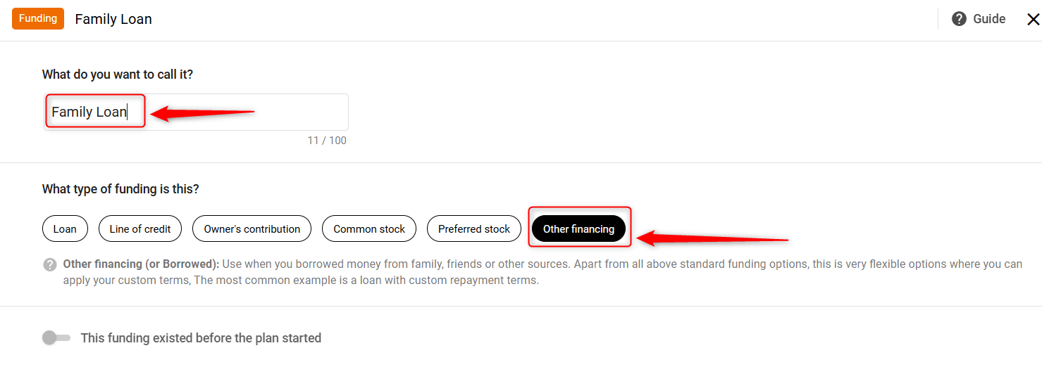 Enter a name for the loan(borrowed on interest), and select the funding type as Other Financing(Borrowed). Toggle the switch if this funding existed before the plan started.