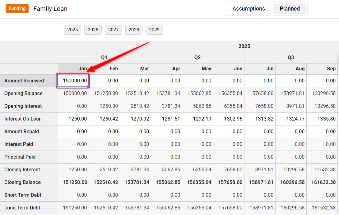 Amount Received: Enter the amount of money you'll receive and when you'll receive it. You can enter a single amount in a single month or amounts in multiple months, depending on how your loan is structured. The system will automatically calculate interest on the loan and other parameters using the standard loan formula: