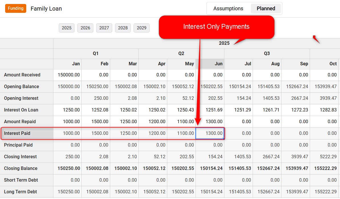 When you enter a Standard loan into your finance forecast, the software will automatically begin applying interest and calculating payments the month after you've received the loan. Sometimes, a loan agreement will have you paying only the interest on the loan for a period of time, and then starting to make payments against the principal later. Here's how to represent that kind of loan in your forecast.