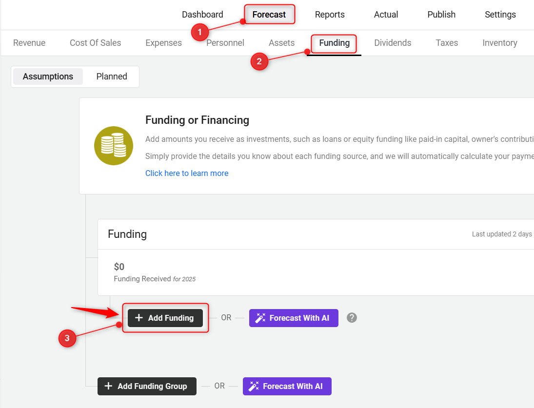 Under the Forecast tab of the Finance Forecasting module, click on the Funding tab, and then click the Add Funding option: