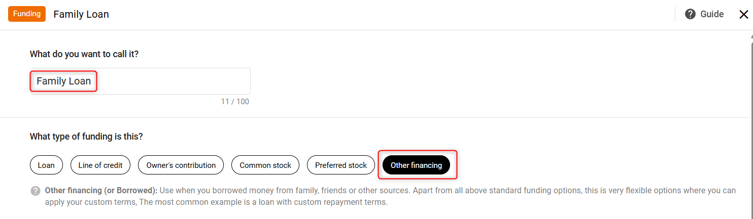 Enter a name for the loan(borrowed on interest), and select the funding type as Other Financing (Borrowed):