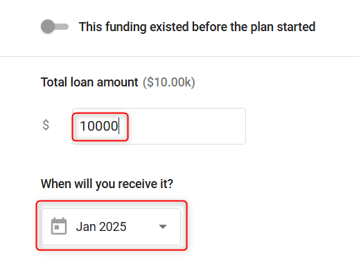 Toggle the switch if this funding existed before the plan started. Enter the total loan amount and set the fund's receiving date.