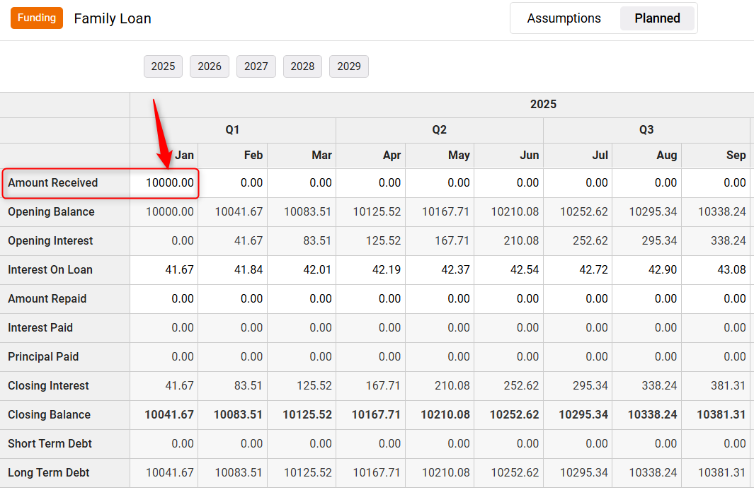 Amount Received: Enter the amount of money you'll receive and when you'll receive it. You can enter a single amount in a single month or amounts in multiple months, depending on how your loan is structured. The system will automatically calculate interest on the loan and other parameters using the standard loan formula: