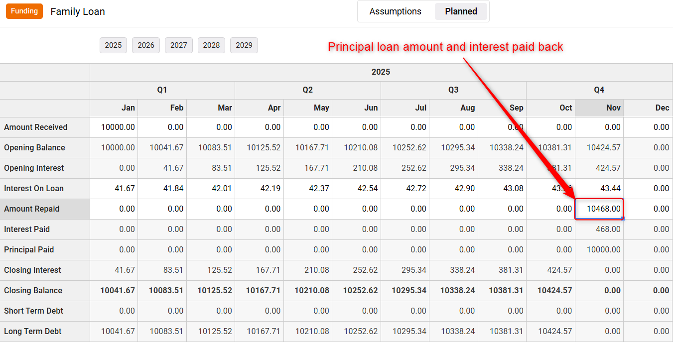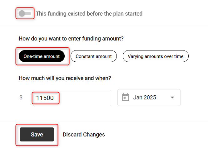 Toggle the switch if this funding existed before the plan started. Enter the full amount of the original loan plus interest. Select the same month in which you represented the loan entry being paid in full and click on Save.