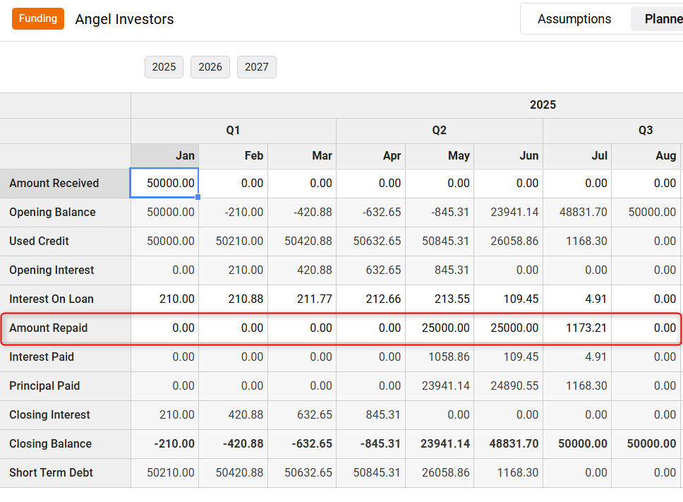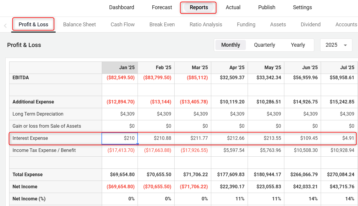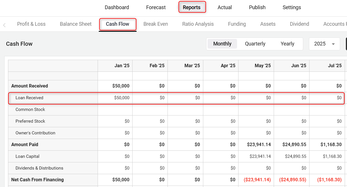 In the Cash Flow, the debt of your line of credit will be calculated in the Loan Received section.